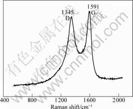 Fig.3 shows the Raman spectrum of carbon nanotubes which was obtained with a REINSHAW optical confocal Raman microscope. The sample excitation was performed using 5 mW of 514.5 nm laser with 3 ?m spot size. The spectrum shows the peak frequency of the graphite mode at 1 591 cm-1 (G) and contains disordered modes at 1 345 cm-1 (D). When compared with the Raman spectra of carbon nanotubes synthesized by other methods, such as arc discharge[14] and chemical vapor deposition [15], the present Raman spectrum obviously gives the large ratio of ID/IG. This phenomenon illustrates that the carbon nanotubes synthesized by ECC technique have a lot of disorder struc-