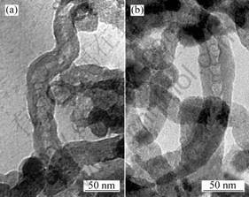 Fig.4 shows the TEM images of carbon nanotubes by employing 0.1 mol/L iron chloride catalyst precursors. The carbon nanotubes with diameter of about 40 nm shown in Fig.4 have a clear bamboo-like structure. While for 1 mol/L iron chloride catalyst precursor it is found that there is no carbon nanotubes except solid carbon nanowires with diameter ranging from about 50 to 150 nm.