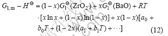 R is the gas constant, and X is the molar fraction of BaO. The interactive parameters a0, b0, a1 and b1 are to be optimized. The CSS and TSS were described by an analogous equation. Due to the very limited solubility of ZrO2 in halite BaO and BaO in m-ZrO2, the BaOSS (halite BaO solid solution) and MSS (monoclinic ZrO2 solid solution) were treated as pure compounds in this work.