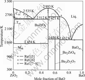 The Gibbs energies of formation of BaZrO3 relative to the pure oxides in the temperature range from 960 to 1 210 K, and from 1 180 to 1 320 K were determined by JOCAB et al[13] and LEVITSKII[15] using electro- motive force, respectively. JOCAB et al[13] also reported the enthalpies of formation of BaZrO3 from the component oxides in the temperature range from 960 to 1 210 K, which were in good agreement with the value at 1 060 K reported by MUROMACHI et al[20]. These data were not used in the optimization. However, they were compared with the calculated results in order to check the final modelling.