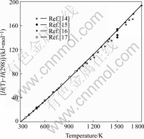 Several groups[13-19] investigated the thermo- dynamic properties of BaZrO3. Using high-temperature differential calorimeter, NAGARAJAN et al[14] reported the enthalpy increments H(T)-H(298) for BaZrO3 from 1 000 to 1 700 K. Drop calorimetry was used by LEVITSKII[15], for H(T)-H(298) measurements on BaZrO3, respectively. BANERJEE et al[16] determined H(T)-H(298) of BaZrO3 by a precise high-temperature Calvet micro- calorimeter in the temperature range from 365.7 to 981 K. CORDFUNKE et al[17] also reported the enthalpy values for BaZrO3 in their compilations. GOSPODINOV et al[18] reported enthalpy data for BaZrO3 in the temperature range between 298 and 500 K by differential scanning calorimeter(DSC). These experimental data[14-16] except those of Ref.[18] were in good agreement with each other and join smoothly with the adiabatic measurements carried out by KING et al[19]. They were used to evaluate the Gibbs energy of BaZrO3. Data from GOSPODINOV et al[18] were too high to have any physical meaning and were excluded in this work. The estimated data from CORDFUNKE et al[17] were not adopted, since they were directly connected with the thermodynamic parameters.