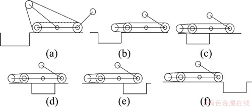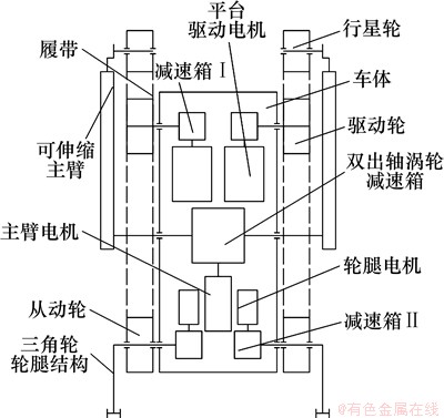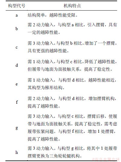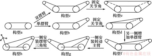构型推衍如图1所示。从图1可见:固定履带式行走机构(构型a)增加摆臂后可形成四履带式机构(构型b)与六履带式机构(构型c);四履带与六履带机构的关节角固定时分别形成三角履带机构(构型d)与梯形履带式行走机构(构型e);在三角履带机构一侧增加摆臂履带,可形成复合履带机构(构型f);若用摆臂三角轮替换摆臂履带,可形成以履带机构为主的轮履复合机构(构型g);将轮履复合机构的三角履带部分的固定关节角移至车体中心并构成转动副可形成构型可变的轮履复合机构平台(构型h)。