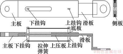 图3所示为履带自张紧式主臂可变构型机器人样机[20],图4所示为机器人平台的内部传动图。机器人主要由车体、驱动电机、驱动轮、从动轮、行星轮、轮腿机构、履带以及可伸缩主臂构成。驱动轮,从动轮分布于车体前后端,主臂位于车体左右两侧,轮腿机构位于车体后方左右两侧。在弹簧的拉伸补偿下,履带可以在运动周期中保持连续张紧状态。为了避免车体的横向尺寸过大,机器人平台采取了涡轮蜗杆减速箱与减速电机组合的驱动方式。具体驱动关系为:主臂驱动电机转动驱动双输出轴涡轮蜗杆减速箱带动两侧的可伸缩主臂转动,主臂转动带动行星轮转动,行星轮轮心的轨迹即为椭圆。驱动轮与从动轮安装于椭圆轨迹焦点位置,行星轮轮心转动即可实现平台的构形变化。左右对称布置减速箱与平台驱动电机实现差速转向、前进和后退等基本动作。轮腿电机驱动减速箱带动三角轮轮腿机构转动,使其上下摆动从而实现辅助支撑越障功能。其中,可伸缩主臂部分如图5所示,主要包括:底板、上压板,侧压板、拉伸弹簧、上挂钩、下挂钩和滑板。滑板位于底板和上压板之间,两侧压板位于滑板左右两侧,两上挂钩分别位于底板和上压板上,两下挂钩位于滑板前后两侧。主臂摆动时,滑板受拉伸弹簧拉动向上或者向下移动,从而实现履带张紧动作。