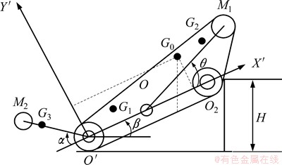 机器人攀爬台阶的动作过程如图6所示。当机器人平台的质心越过台阶的外角线时,平台此时具备了完成攀越台阶的充分条件,可以完成攀爬台阶的动作。建立如图7所示以O′为坐标原点,以平行于O′O2的直线为