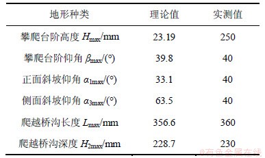 (2) 从运动学的角度对平台攀爬台阶、攀爬斜坡,爬越桥沟进行了机理及性能分析,绘制了相关参数图形,推导出最大越障性能参数。