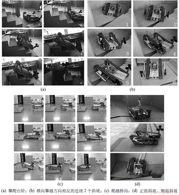 主臂可变构型履带机器人样机的主要参数为:m1=25 kg,m2=5 kg,m3=2 kg,L1=L4=L8=330 mm,L3=L7=125 mm,L6=660 mm,R=76 mm,L2=L5=437~547 mm,P1=70 mm,b0=660 mm。对样机进行越障性能测试。图14所示分别为样机实现攀爬台阶、横向攀越方向相反的连续两斜坡、正面、侧面斜坡仰角,爬越桥沟的动作截图,测试结果见表4。