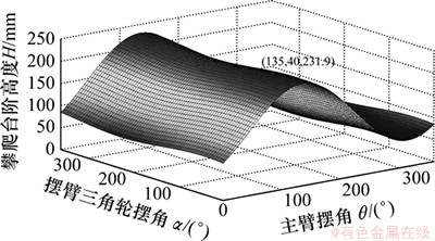 (1) 将参数代入式(2)中,得出机器人攀爬台阶高度H与α和θ的关系如图15所示。由计算结果可知:当θ=135°,α=40°时,