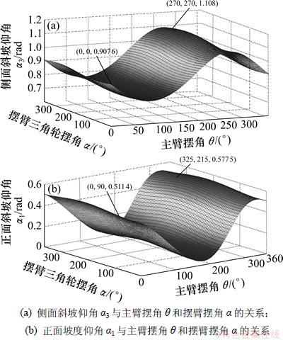 图16 正面、侧面坡度仰角与主臂摆角和摆臂摆角关系