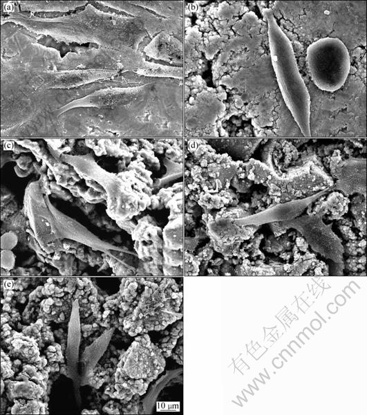 Fig.6 Surface morphologies of MG63 cells cultured for 8 d on porous titanium with different porosities: (a) 5% group; (b) 30% group; (c), (d), (e) 60% group
