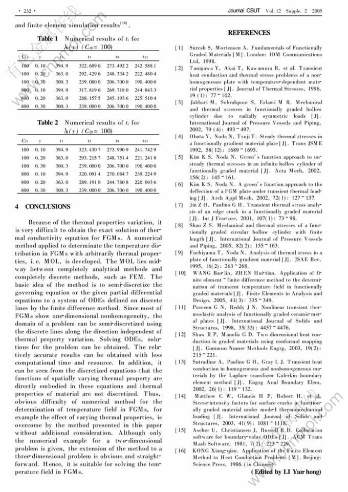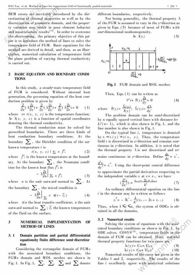 Abstract: The finite element method (FEM) and the boundary element method (BEM) are often adopted. However, they are not convenient to spatially vary thermal properties of functionally graded material (FGM). Therefore, the method of lines (MOL) is introduced to solve the temperature field of FGM. The basic idea of the method is to semi-discretize the governing equation into a system of ordinary differential equations (ODEs) defined on discrete lines by means of the finite difference method. The temperature field of FGM can be obtained by solving the ODEs. The functions of thermal properties are directly embodied in these equations and these properties are not discretized in the domain. Thus, difficulty of FEM and BEM is overcome by the method. As a numerical example, the temperature field of a plane problem is analyzed for FGMs through varying thermal conductivity coefficient by the MOL.