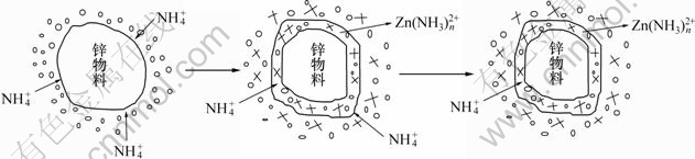 浸出过程是由含锌物料与溶液所组成的多相反 应[16-19]。本研究体系中,浸出过程机理和步骤可以分解为以下3个步骤(见图2):