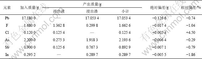 由表3可以看出,在浸出过程中杂质元素Pb,As,Sb和In主要进入浸出渣中,从而很好地与主元素Zn分离,F和Cl进入浸出液,将在后续工序中除去,各杂质元素平衡情况良好,但Cl的正偏差较大,其主要原因是在浸出过程中采用了自来水,从而使溶液中Cl含量分析结果偏高。