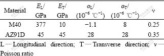 The M40 graphite fibres were used to reinforce AZ91D alloy by pressure infiltration method. Fibre volume fractions in unidirectional M40/AZ91D composite and orthogonally fabric M40/AZ91D composite were about 60% and 55%, respectively. Table 1 lists the nominal compositions of AZ91D alloy; and the physical properties of M40 fibre and AZ91D are listed in Table 2.