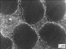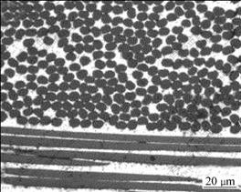 Fig.1 shows the microstructure of the polished and etched M40/AZ91D composites. M40/AZ91D composites are well infiltrated with good fibre dispersion. Pores or significant casting defects are not observed. The diameter of single fibre is about 6.5 μm. Fig. 2 displays the microstructure of the casting AZ91D alloy. The grain size of cast AZ91D alloy is about 300 μm, and Mg17Al12 precipitates and discontinuous blocky β precipitates are observed on the grain boundary[16-17]. It is reported that large grains may deteriorate the dimensional stability of alloy matrix.