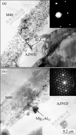 1) The combination between Mg alloy and M40 graphite fibres is good, and Al segregated at the interface mainly exists in the form of interfacial reactant Al4C3 and precipitate Mg17Al12.