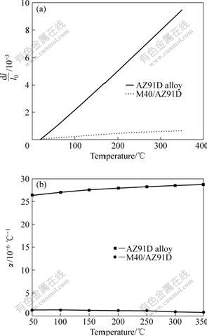 Fig.5 Temperature dependence of relative linear length change (a) and CTE (b) for unidirectional M40/AZ91D composite and AZ91D alloy