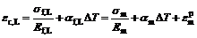 where σ and ε represent stress and strain, respectively; α and E are coefficient of thermal expansion and elastic modulus, respectively; ΔT is the change from the reference temperature; and subscripts m, f and c refer to the matrix, fibre and composite, L refers to longitudinal direction, and p denotes plastic.