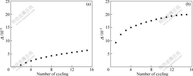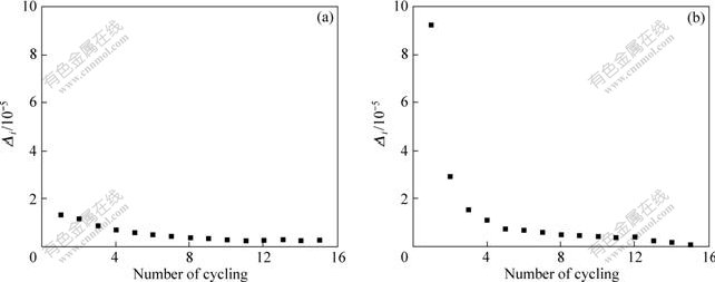 where li-1 and li refer to the sample length at 20 ℃ after i-1 and i cycles, respectively. Certainly, i is in the range of 1-15. The magnitude of Δi represents the residual length change in i cycles. Fig.9 shows the results of variation of Δi with cycling number.
