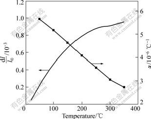 Fig.10 reveals the relative linear length change and CTE with the variation of temperature of orthogonally fabric M40 reinforced AZ91D composite. Similar to unidirectional M40/AZ91D composite, the CTE of orthogonal fibre reinforced AZ91D composite decreases at elevated temperature, from 5.71×10-6 ℃-1 at 20 ℃ to 2.75×10-6 ℃-1 at 350 ℃.