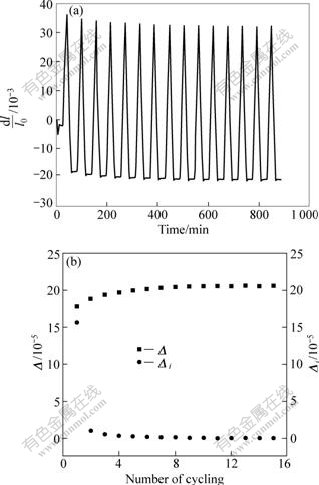 Fig.11 Time dependence of relative length change (a) and Δ and Δi vs cycling numbers (b) for orthogonally fabric M40/AZ91D composite