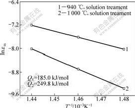 合金经940和1 000 ℃固溶及时效处理后,在400~420 ℃和575 MPa条件下,测定各自合金在稳态蠕变期间的应变速率与温度的关系,结果如图2所示。在试验温度和应力范围内,根据图2可计算出各自合金在稳态蠕变期间的激活能分别为Qa1=185 kJ/mol和Qa2=249.8 kJ/mol。结果表明,经1 000 ℃固溶及时效处理后,合金具有较好的蠕变抗力。