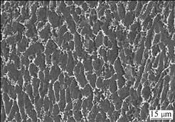 Ti-6Al-4V合金经热连轧后的纵断面组织形貌如图3所示。由图3可知,Ti-6Al-4V合金具有与等温锻造合金相同的组织结构,均由α和β两相组成。图3中暗色区域为α相,白色的网状组织为β相,合金中的α相沿轧制的流变方向呈类条状分布,β相沿条带状α相的边界呈网状分布,其中条带状α相的长度约为15 μm,宽度约为5 μm,且α相中无明显析出物,并均匀分布。