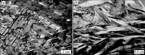 合金中网篮组织的TEM像如图5所示。经电子衍射及微区成分分析表明,在网篮组织中的条束状暗色区域为BCC结构且富含元素V的β相,而β相间的白色针状相为α相,如图5(a)所示。由图5可以看出,条状β相具有多组平行束的特征,且平行束之间互成60?角,并在网篮组织的局部区域存在针状或片状马氏体,如图5(b)所示。