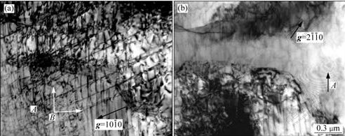 (照片略去)衍射条件下,垂直方向的位错A和近水平方向的位错B均失去衬度,由此可以确定,垂直方向的位错A是Burgers矢量为b=(1/3)[1120]的áa?位错,且在
