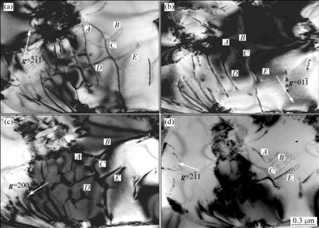 条件下,位错D和位错E的衬度同时消失,如图8(b)所示。由此可以确定,近水平方向的位错D和位错E是Burgers矢量为bD=bE=(1/2)
