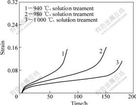 Fig.1 Creep curves of Ti-6Al-4V alloy after solution treatment at different temperatures measured at 420 ℃ and 575 MPa