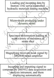 The SFRC split tension complete process experiment at intermediate strain rate used Instron 1342 servo-controlled hydraulic materials test machine as a loading device. Because the original dynamic strain collecting device of the test machine cannot meet the expected experiment precision, after a lot of test comparisons, the author took DH-5932 data incepting and analyzing instrument and DH-3840 programmable amplifier (made by Donghua Testing Technology Development Co. Ltd. Jiangsu, China) as recording devices for dynamic strain, and after assistant design, constituted a dynamic testing system based on Instron materials test machine. The experimental design principle is shown in Fig.1.