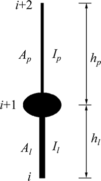 根据经典梁理论,考虑构件截面尺寸变化对杆件特性的影响,计入杆件质量对结构动力响应的贡献,引入质量偏心概念。将变截面杆件做离散化分析,通过对杆件上下段的杆件等效特性计算,建立动力分析的变截面单元,计算简图如图1所示。图中:hl和hp分别为单元在i~i+1和i+1~i+2段的长度;Il和Ip分别为单元在i~i+1和i+1~i+2段的等效惯性矩;Al和Ap分别为单元在i~i+1和i+1~i+2段的等效面积;mi+1为单元的总质量。