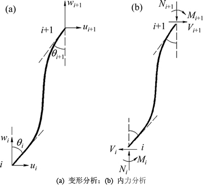 图2所示为梁单元杆端力与位移的分析简图。根据经典梁理论[15],建立杆端力与位移的关系表达式: