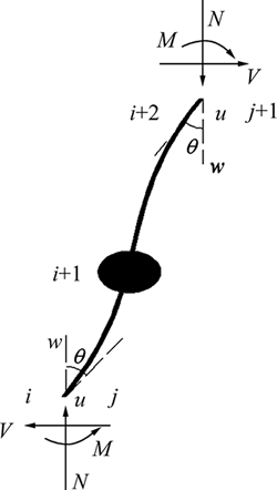 为截面形状系数,Al为截面等效面积;N为杆件轴力,Nl=Ni;V和M分别为杆件端部的剪力和弯矩;w,u和