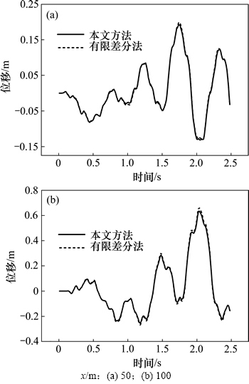 由图8可知:本文方法计算结果与有限差分法计算结果吻合较好,仅有细微差异。计算结果表明本文方法正确,如对时间和结构离散的足够小,本文方法为精确解。对比图8(a)和图8(b)可知:x=50 m处结构起振时刻为t=0.08 s,而x=100 m处结构的起振时刻为t=0.15 s,此外对比结构峰值位移出现时刻均能表明结构超高桥墩的振动传递具有时间滞后性。
