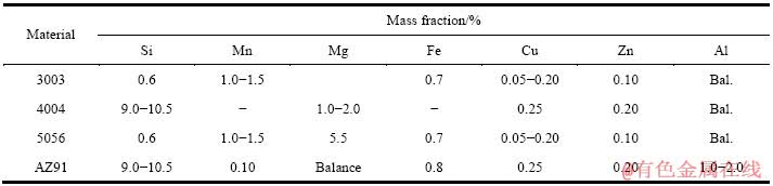 在金属凝固过程中施加旋转磁场,会在金属熔体内部产生一个电磁力分量,其方向与磁场旋转方向相同,将驱动金属液中产生强迫流动。如果处于旋转磁场中的铸锭外层为一种固态金属,内层为另外一种液态金属,那么内层熔体强迫流动将对两种金属的界面结合状态、过渡层的形成以及相结构等产生重大影响。为了研究电磁搅拌作用对界面处金属凝固行为的影响规律,本文作者选用两种不同复合类型的复层材料,一种为没有界面反应的3003/4004铝铝复层材料,一种为有界面反应的5056/ AZ91铝镁复层材料,考察电磁搅拌对复层铸锭的宏观形貌、结合界面的微观组织、成分分布的影响,研究两种不同类型的复层铸锭在有无电磁搅拌情况其结合界面的凝固过程及结合机理。