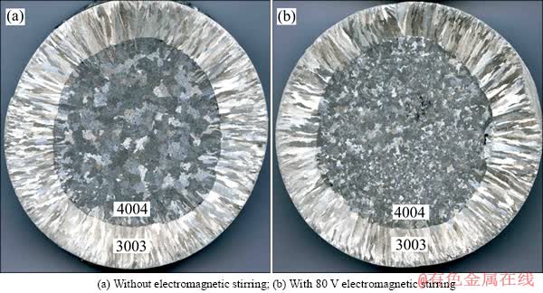 1) 在未加电磁搅拌及施加80 V电磁搅拌的情况下,成功制得界面复合良好的3003/4004铝合金复层材料,经过电磁搅拌处理的铸坯,其心部晶粒组织比相同条件下未经电磁搅拌处理的铸坯组织更为细小。