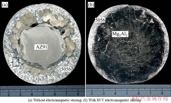 对比电磁搅拌对3003/4004和5056/AZ91两种复合材料的影响,可以看出,对于不会发生化学反应的3003/4004合金,电磁搅拌可以细化内部4004合金凝固组织,进而改善3003/4004复合材料界面组织性能;而对于发生化学反应的5056/AZ91合金,电磁搅拌加速了铝镁之间的反应,使得金属间化合物区域增大。