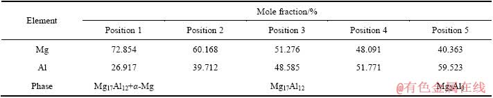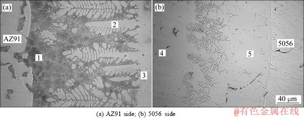 图4所示为有无电磁搅拌情况下5056/AZ91复层材料界面的宏观组织。如图4(a)所示,将镁合金浇注到具有一定温度的固态铝合金凝壳中时,两种金属会发生反应,形成一定厚度的过渡层,过渡层内生成异于两侧基体的脆性金属间化合物。图5所示为未施加电磁搅拌时复层试样界面附近微观组织(取样位置已在图4(a)中标出)。结果表明,从图5(a)左侧的AZ91镁合金到图5(b)右侧的5056铝合金,两种基体之间的过渡层出现了不同类型的金属间化合物(已用数字标出)。经电子探针定量分析(见表4)及X射线衍射分析(见图6(a)),基本可以确定其物相组成。由图5可知,与AZ91基体直接接触层(标注1)为团簇状(Mg17Al12+α-Mg)共晶组织,随后Mg17Al12相逐渐增多,出现树枝状Mg17Al12相(标注2),并过渡至Mg17Al12单相区(标注3和4)。接下来为Mg2Al3单相区(标注5)。根据Al-Mg二元合金相图[14],Mg含量不同会生成不同类型的金属间化合物,而从AZ91侧开始,Mg元素在过渡层中的含量逐是渐降低的,因此在过渡层内出现了不同的金属间化合物。经Image-Pro Plus软件测量,该过渡层约3 mm。施加电磁搅拌后,复层铸锭横截面的宏观形貌如图4(b)所示,可看出界面处与内部呈现相同的组织形貌,分别对其进行XRD分析可以看到(如图6(b)和(c)所示),无论是界面还是心部均为Mg2Al3相。可见,对于有界面反应的5056/AZ91复层材料,未施加电磁场时,两种金属间形成一定厚度的过渡层,过渡层内由Mg17Al12 及Mg2Al3两种相组成;施加一定强度的电磁搅拌可以促进两种合金之间的反应,导致复层铸锭内层几乎都转变为Mg2Al3相。