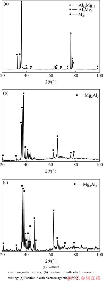 该反应可以使5056外壳内表面的氧化膜发生脱落,进而促进AZ91镁合金熔体与新鲜(未氧化)的5056基体直接接触,在随后的凝固及冷却中直接进行热量传递及原子扩散反应。在无电磁搅拌情况下,由于反应层中AZ91合金侧至5056合金侧Mg含量逐渐降低, Al含量逐渐增加,因此凝固层呈现不同的组织形貌:靠近镁合金一侧形成Mg17Al12 ,靠近铝合金一侧形成Mg2Al3。对铸锭施加电磁搅拌后,内层AZ91熔体在电磁力的作用下发生强迫对流,顺时针旋转的熔体反复冲刷5056铝合金凝壳,铝镁之间发生化学反应,反应产物在电磁力的驱动下进入铸锭心部,随着电磁搅拌的进行熔体的温度会长时间高于铝镁共晶反应温度(437 ℃),这样铝镁反应时间大大增加,铝壳不断被重熔,反应产物不断被分配到铸锭内层各处,最终导致铸锭内层全部生成Mg2Al3。