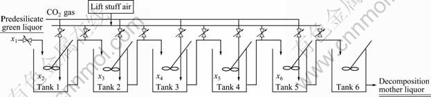 实际生产中连续碳分过程由6个连续分解槽组成,整个过程从原料入槽到出料一般需要3~4 h。如图1所示,经脱硅送来的合格精液首先进入高位槽,从高位槽底部自压进入1#分解槽,用低压风提料进2#分解槽,采用同样的方法依次将料提入后面槽。前5台槽子根据分解率要求通入一定量CO2气体进行分解,通过调节CO2气体的通入量,控制各槽的分解率。6#槽作为出料槽,检测合格后由出料泵打到沉降槽,沉降底流送往氢氧化铝过滤机过滤,得到氢氧化铝 产品。