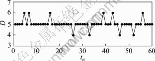 以上是原液氧化铝取第一组数据时的相关性,当原液依次取1到60组数据时,考查原液和其他分解槽内氧化铝浓度数据最大相关性对应的相对滞后周期数。图8所示为1#分解槽的数据相对于原液数据滞后周期数(D)随原液所取数据组数变化的情况。由图8可以看出,当原液的考查数据组由第1组变化到第60组时,它和1#槽内的氧化铝浓度的相关性最大值,基本上保持在5个周期后取得,进一步验证了1#槽的时滞为50 min。