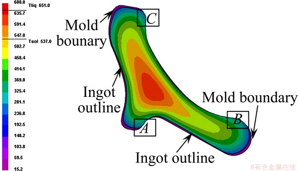 Fig. 13 Temperature distribution inside near-net shape ingot