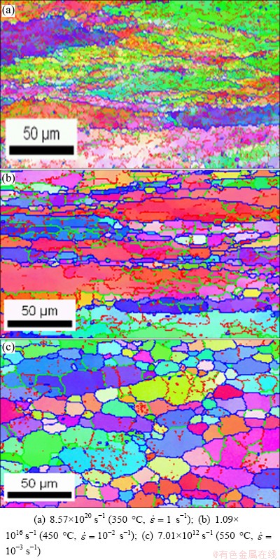 Figure 17 shows the OIM pictures of deformed microstructure. The values of Z parameter which is used to characterize the combined effects of strain rate and deformation temperature are from 7.01×1012 s-1 to 8.57×1020 s-1 in this study. Under large Z parameters of 8.57×1020 s-1, a large number of subgrains are observed in elongated grains and the percentage of subgrains is 64.30%. With Z parameter value decreasing from 1.09×1016 s-1 to 7.01×1012 s-1, proceeding of dynamic recrystallization (DRX) is more adequate. It can be seen that subgrains and recrystallized grains coexist. The percentages of subgrains are 54.98% and 25.12%, respectively.
