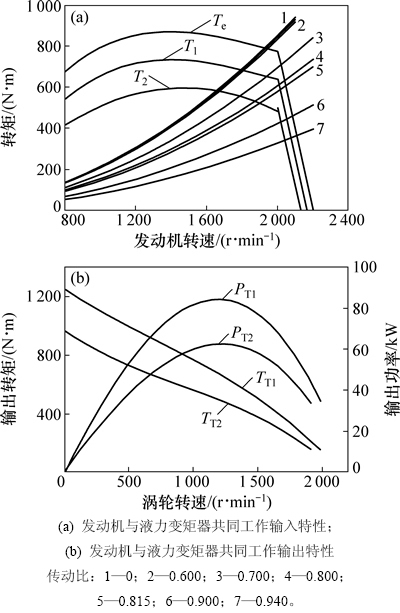 1) 根据发动机和液力变矩器的原始数据及试验数据,计算发动机与液力变矩器共同工作特性,如图3所示。其中:Te为发动机外特性曲线;T1和T2分别为全功率匹配和部分功率匹配发动机净输出转矩曲线;PT1和PT2分别为全功率匹配和部分功率匹配液力变矩器输出功率曲线;TT1和TT2分别为全功率匹配和部分功率匹配液力变矩器输出转矩曲线。