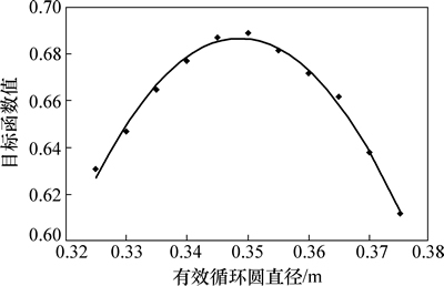 5) 根据式(11)计算不同循环圆直径D对应的目标函数值,并绘制相应关系,如图4所示,当D等于0.350 m时,液力变矩器与发动机的匹配性能最优。