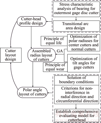 The medium square five-section type of cutter-head was taken as a research object and the star layout pattern was adopted. Based on the principles of equal life and equal wear, related models were established; optimum designs of polar radii for the center cutters and normal cutters and tilt angles for the gage cutters were created; and an adaptive design method based on the profile of the cutter-head was proposed. The boundary conditions of non-interference between the cutters, manholes, muck buckets and welding lines in the radial and circumferential directions were given, and the cutter-head comprehensive evaluation model was established, putting forward a new method for cutter layout. The overall technical route of research is shown in Figure 1.