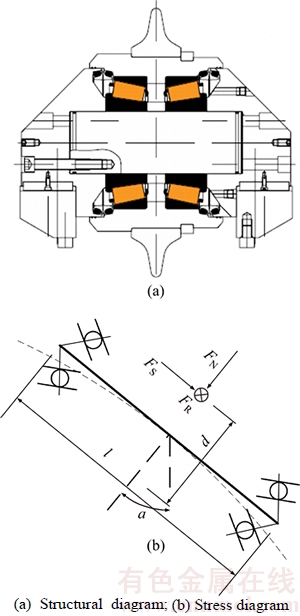 Figure 2 Structure of bearings installed in gage cutters and a simplified force sketch: