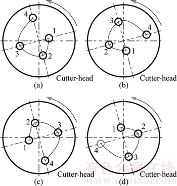 The number of cutters and the tilt angles of the star line groups are known; set every V (V can be 1, 2 or 4) cutters as a group. When determining the layout for each group of cutters, according to the critical interference polar radii determining an optimal star line group and arranging the cutters on it along the reverse of the cutter-head rotation direction. Thus, there are four alternative solutions in each arrangement. Assuming that V=4 in a layout, the four layout schemes are shown in Figure 12. To determine the optimal layout scheme, the synthetic evaluation function values of the cutter-head under different layout schemes should be calculated and compared. Then the minimum value is selected as the result of the layout, and subsequent cutters can be arranged on this basis until all cutters are completed.