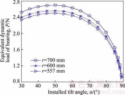 The graph illustrates that when the installed tilt angle α<50°, the equivalent dynamic load P increases with the increase of the installed angle range α; when α≥50°, the result is the reverse. The installed angle range of the gage cutters should thus be larger than 50°. This also shows that the equivalent dynamic load increases with the increase of the fillet radius r under the condition of r≥L; the fillet radius design should thus not be too large.